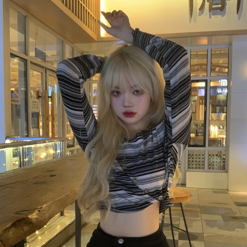 オータムスタンダードブラックショートシャツ スリム薄手ストライプTシャツ ロング レトロ 秋物 Brother_is_Style26743186715
