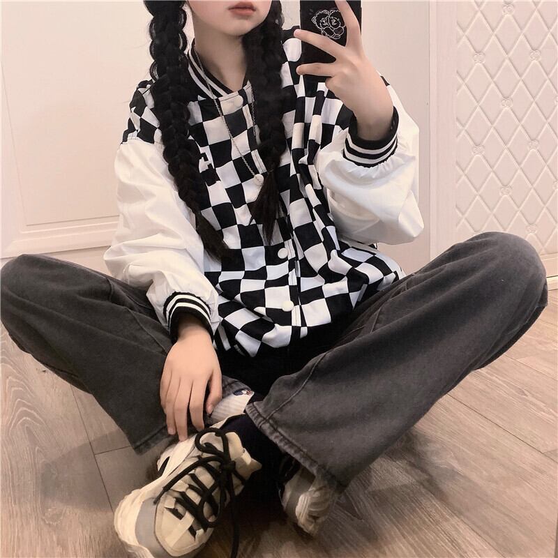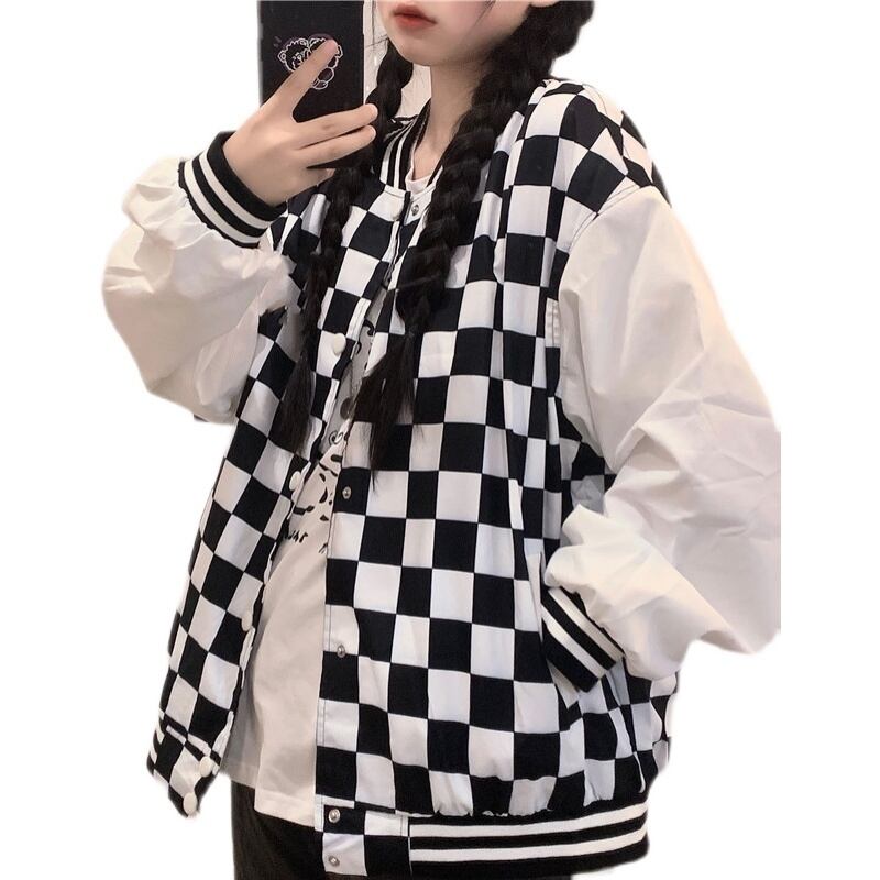 オータムスタンダードブラック格子柄トップス ルーズジャケット ロング レトロ 秋物 Brother_is_Style73592505446