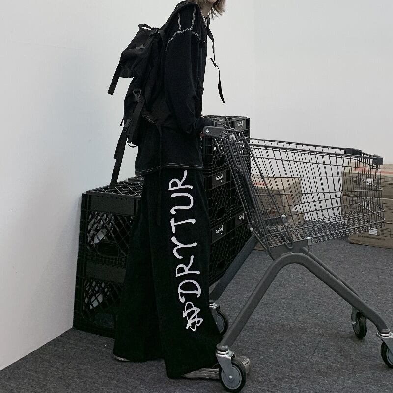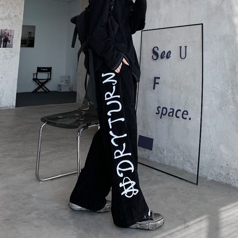 オータムプリントブラックカジュアルパンツ ルーズ薄手ハイウェストウェスト ストリート 秋物 Brother_is_Style85465044603