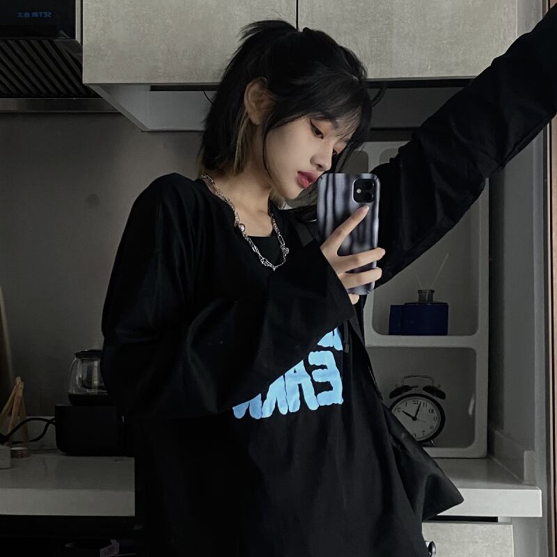 オータムスタンダードブラックプリントトップス ルーズシャツ Tシャツ ロング レトロ 秋物 Brother_is_Style80690257607