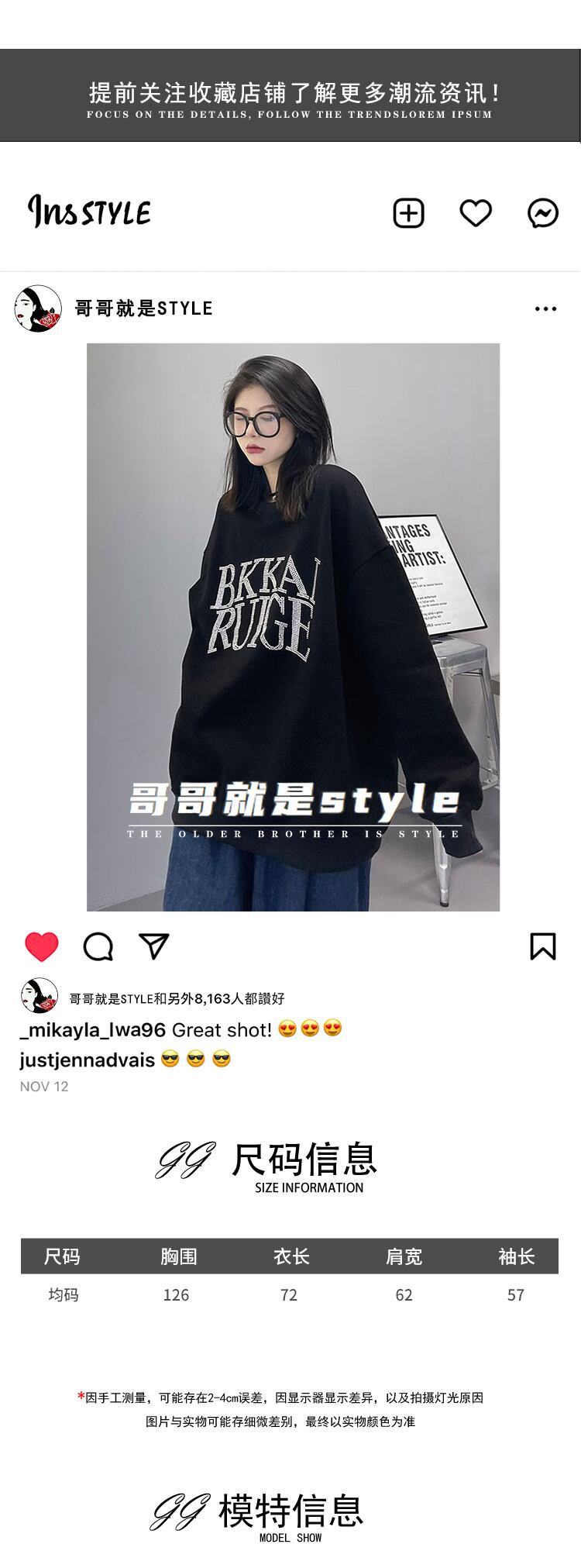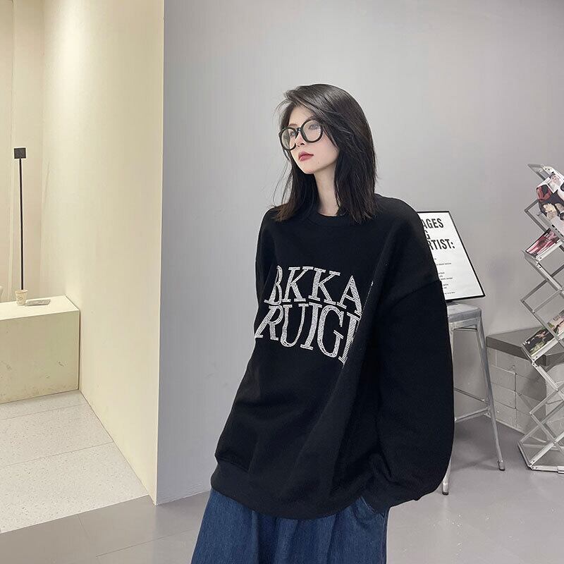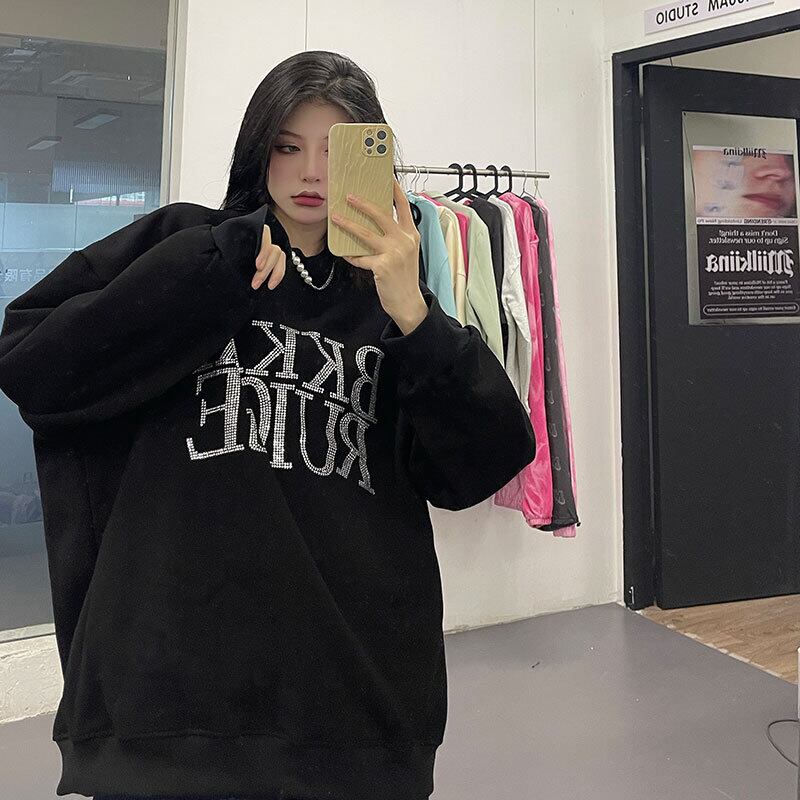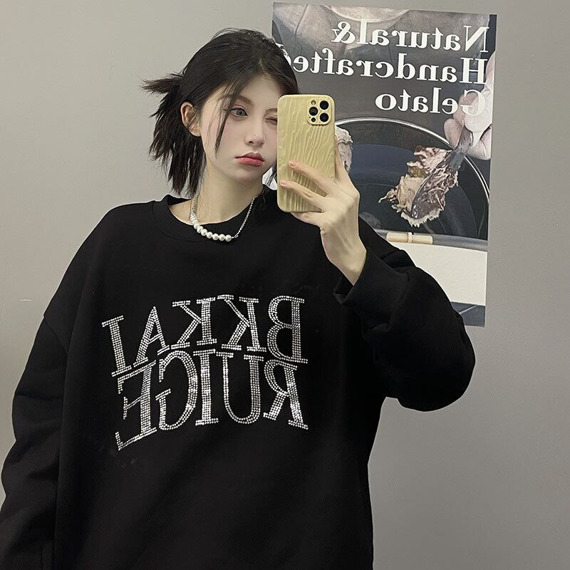 オータムラインストーンフードセーター コート ルーズブラックトップス レディース ロング 秋物 Brother_is_Style17245240589