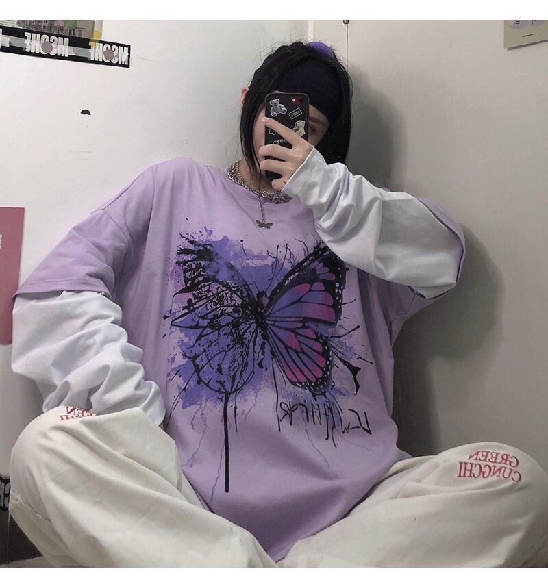 オータムスタンダードButterflyデザイン プリント柄ルーズTシャツ トップス ロング レトロ ストリート 秋物 パープル Brother_is_Style10422919649