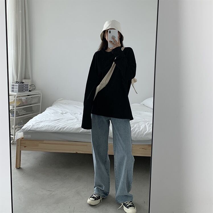 オータム薄手ホワイトTシャツ シャツ ルーズブラックトップス ロング 秋物 Brother_is_Style14223905666