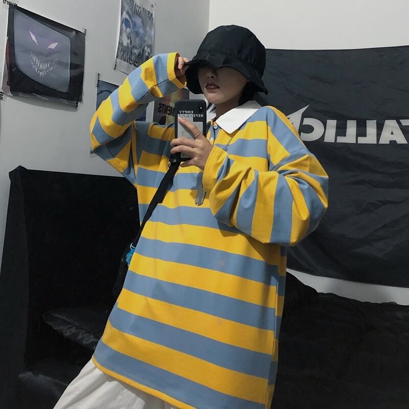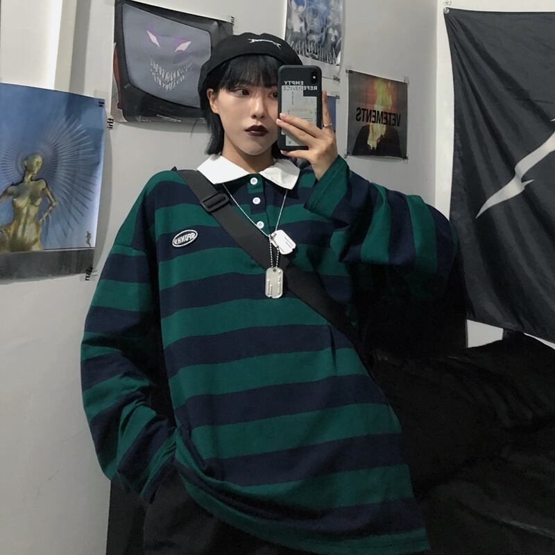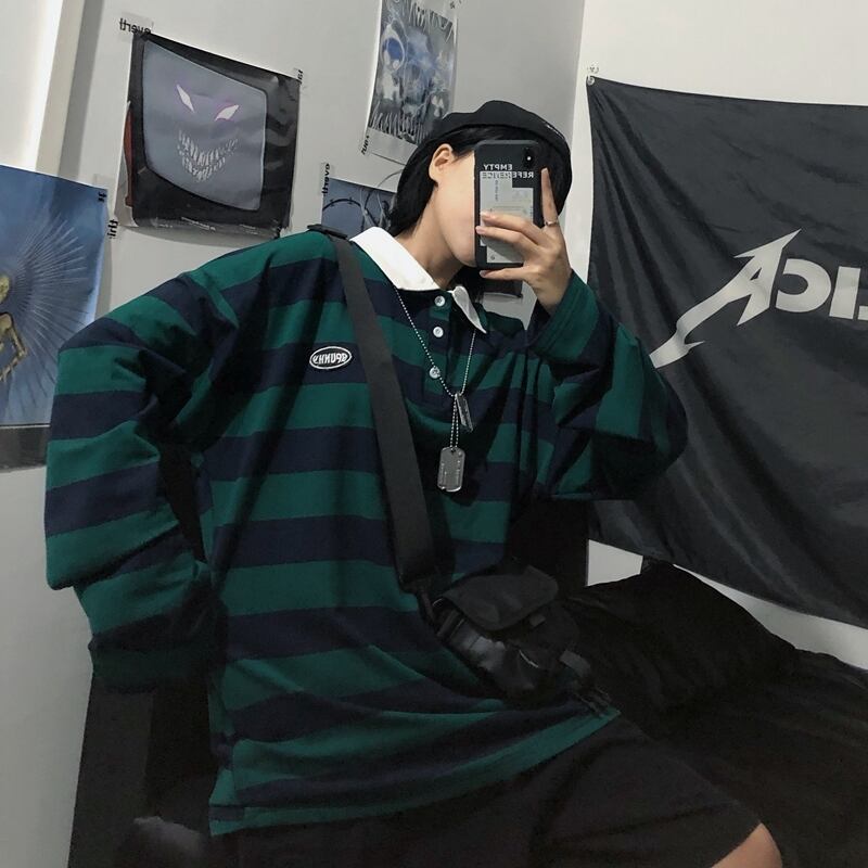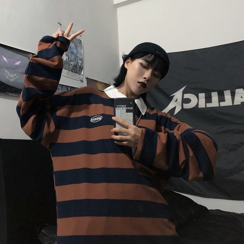ストライプTシャツ シャツ オータムスタンダードルーズトップス ロング レッド レトロ 刺繍 秋物 Brother_is_Style86680367594