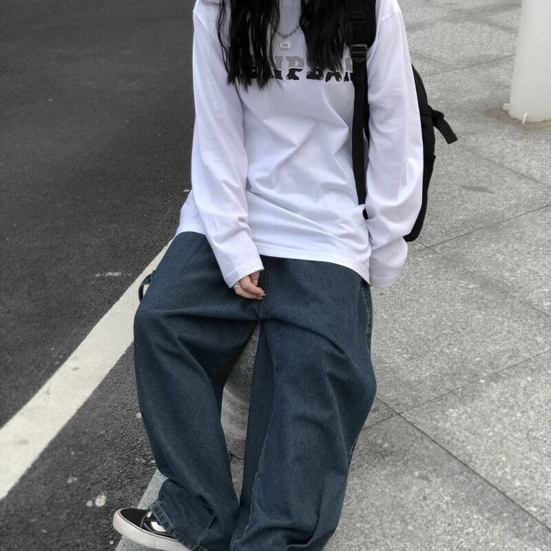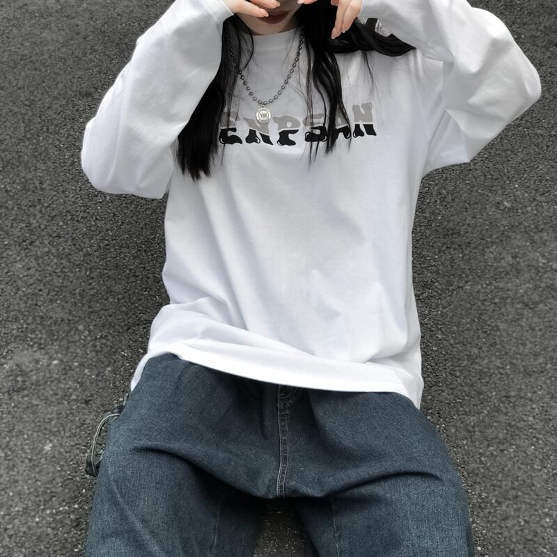 オータムプリント柄ブラックTシャツ ルーズラウンドネックトップス レディース ロング ストリート 秋物 Oネック Brother_is_Style54957596082