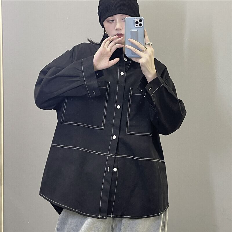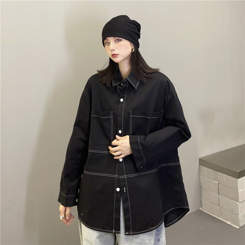 シャツ オータムスタンダードラインジャケット ブラックルーズブラウス ロング レトロ 秋物 Brother_is_Style91148144742