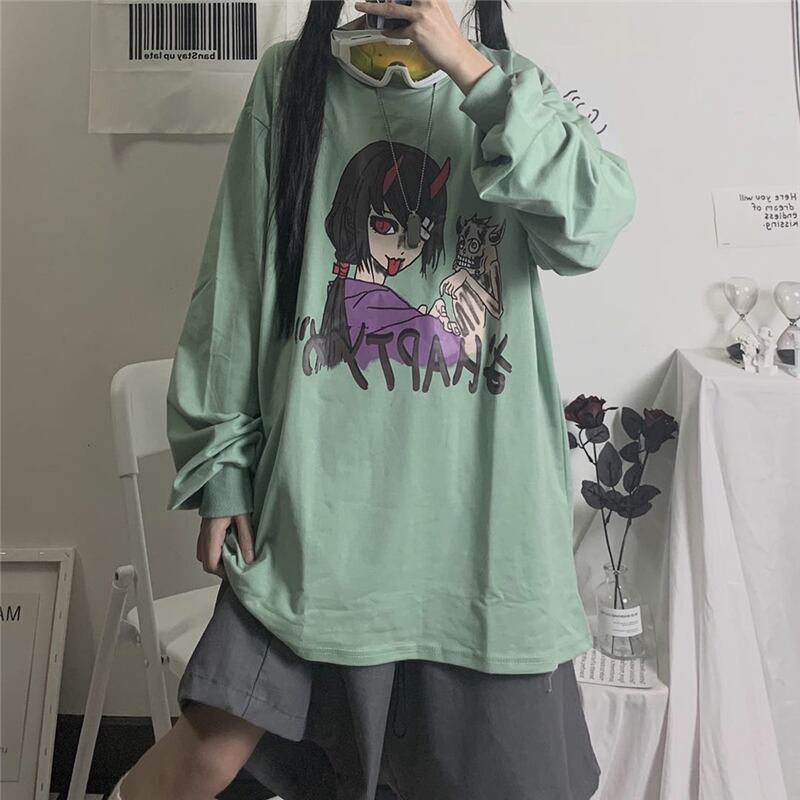オータムダークスタンダードプリントTシャツ シャツ ブラックルーズトップス ロング レトロ 秋物 Brother_is_Style3837988835