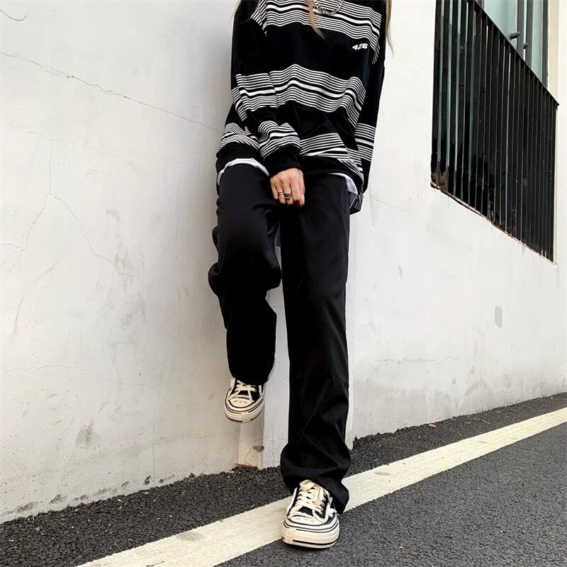ブラックハイウェストウェストスリムカジュアルパンツ オータムルーズワイドレッグ 秋物 ワイドパンツ Brother_is_Style7704230634