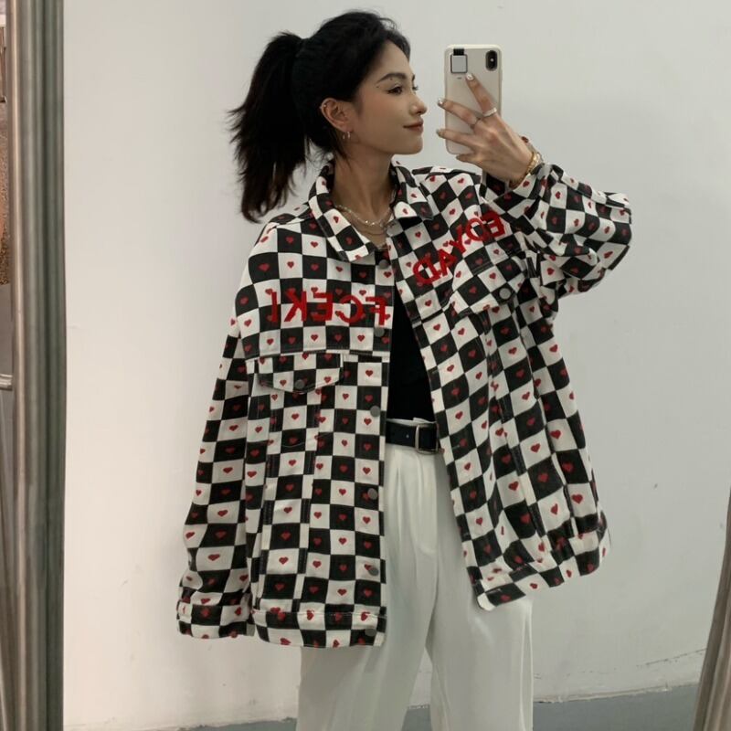 オータムスタイル格子柄ジャケット ルーズ ロング レッド 刺繍 秋物 Brother_is_Style83134547109