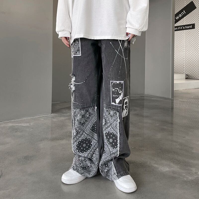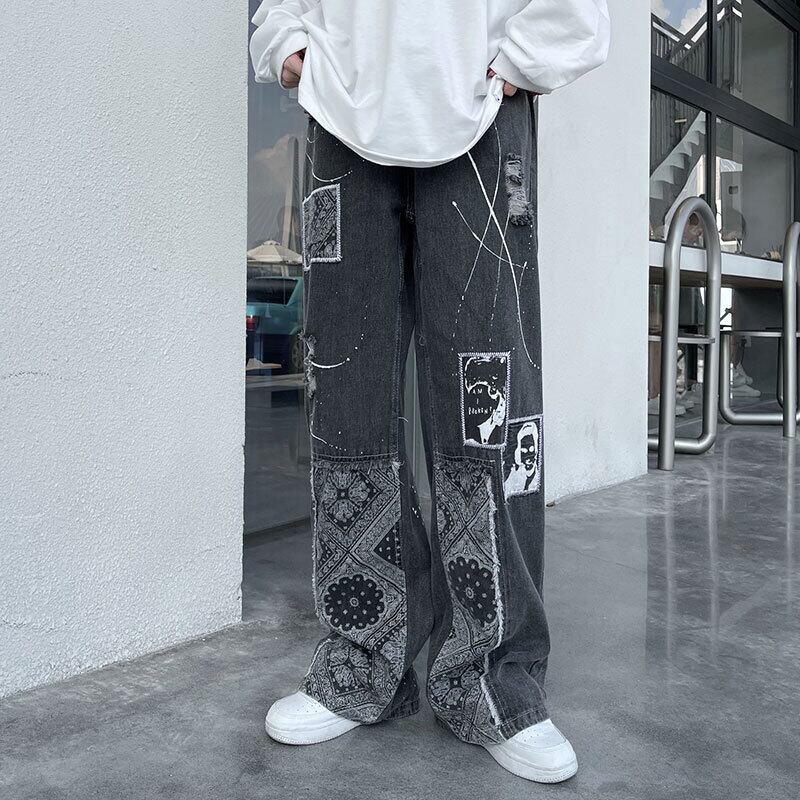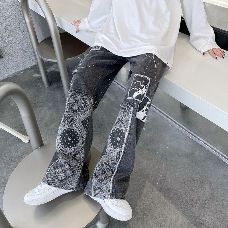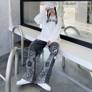 パンツ オータムFlowerデザイン ジーンズ ルーズハイウェスト薄手 ストリート 秋物 フラワーデザイン Brother_is_Style57583560283