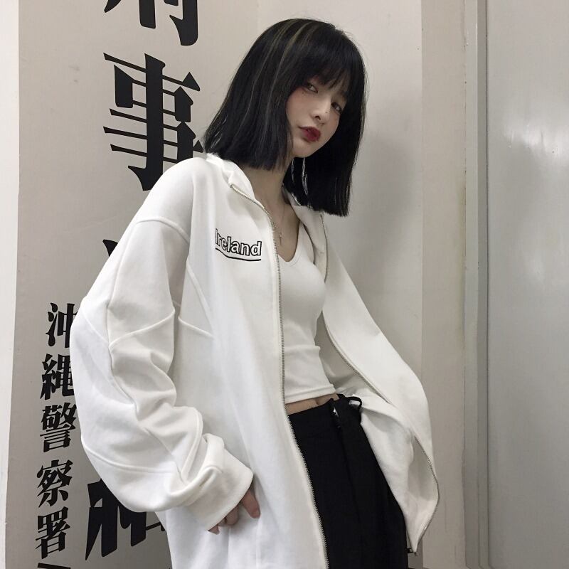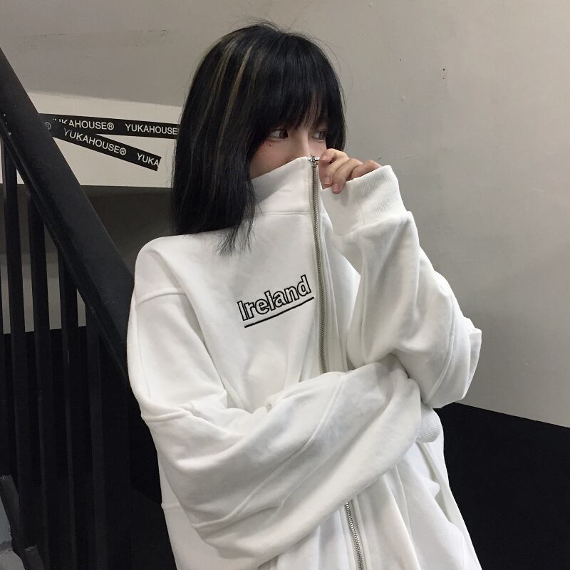 オータムスタンダード刺繍ホワイトジッパージャケット ルーズカーディガントップス ロング レトロ 秋物 Brother_is_Style64108276617