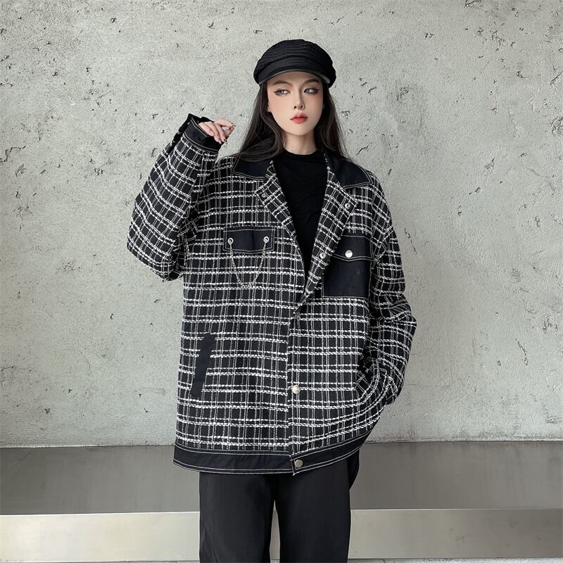 オータムスタンダードロング格子柄ジャケット ルーズトップス レトロ 秋物 Brother_is_Style47676011393