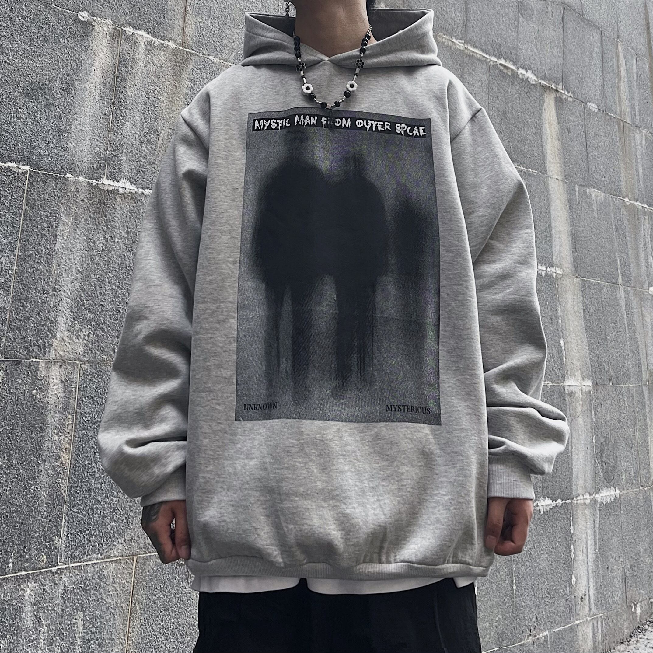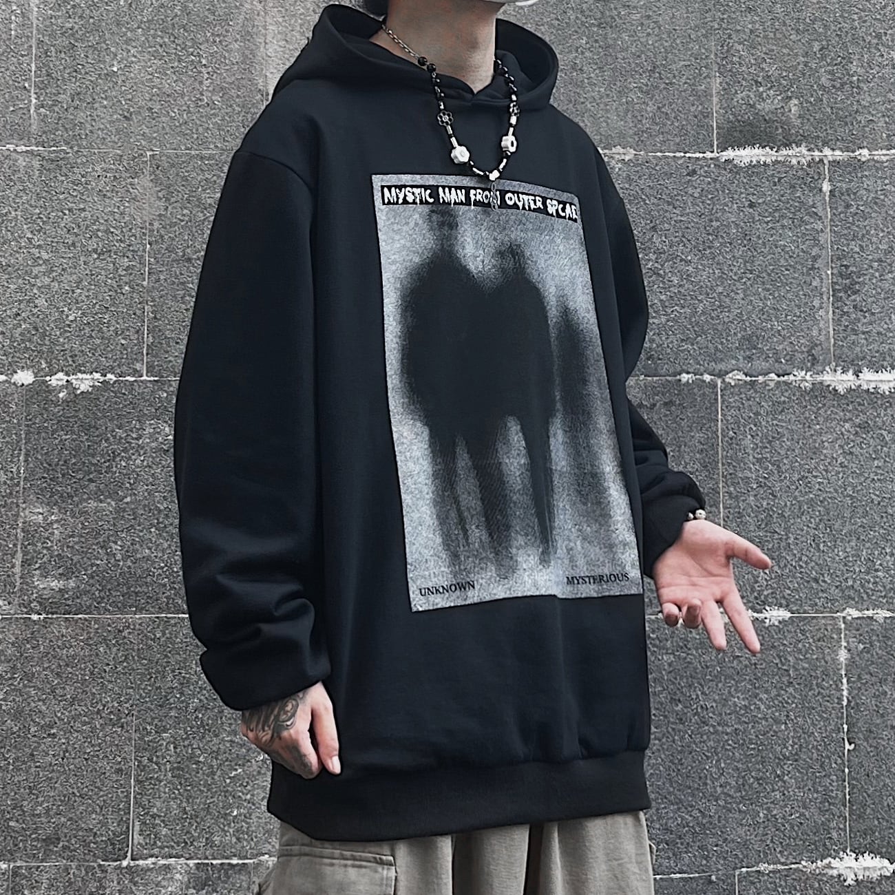 オータムダークブラックプリント柄フードセーター コート ルーズトップス レディース ロング ストリート 秋物 Brother_is_Style43700999335
