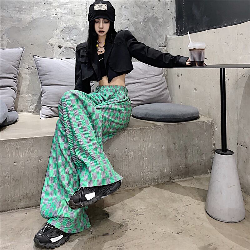 スタンダードグリーン格子柄ワイドレッグパンツ オータムハイウェストウェストカジュアルルーズ レトロ 秋物 ワイドパンツ Brother_is_Style29690901870