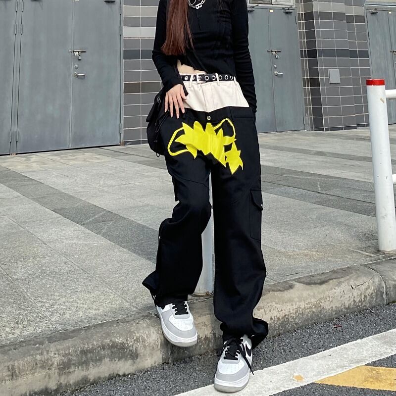 パンツ オータムプリント柄ブラックカジュアルルーズハイウェストウェストワイドレッグ ストリート 秋物 ワイドパンツ Brother_is_Style44468650452