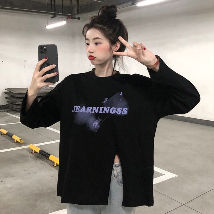 オータムプリントTシャツ ルーズホワイトトップス レディース ロング 秋物 Brother_is_Style67982284420