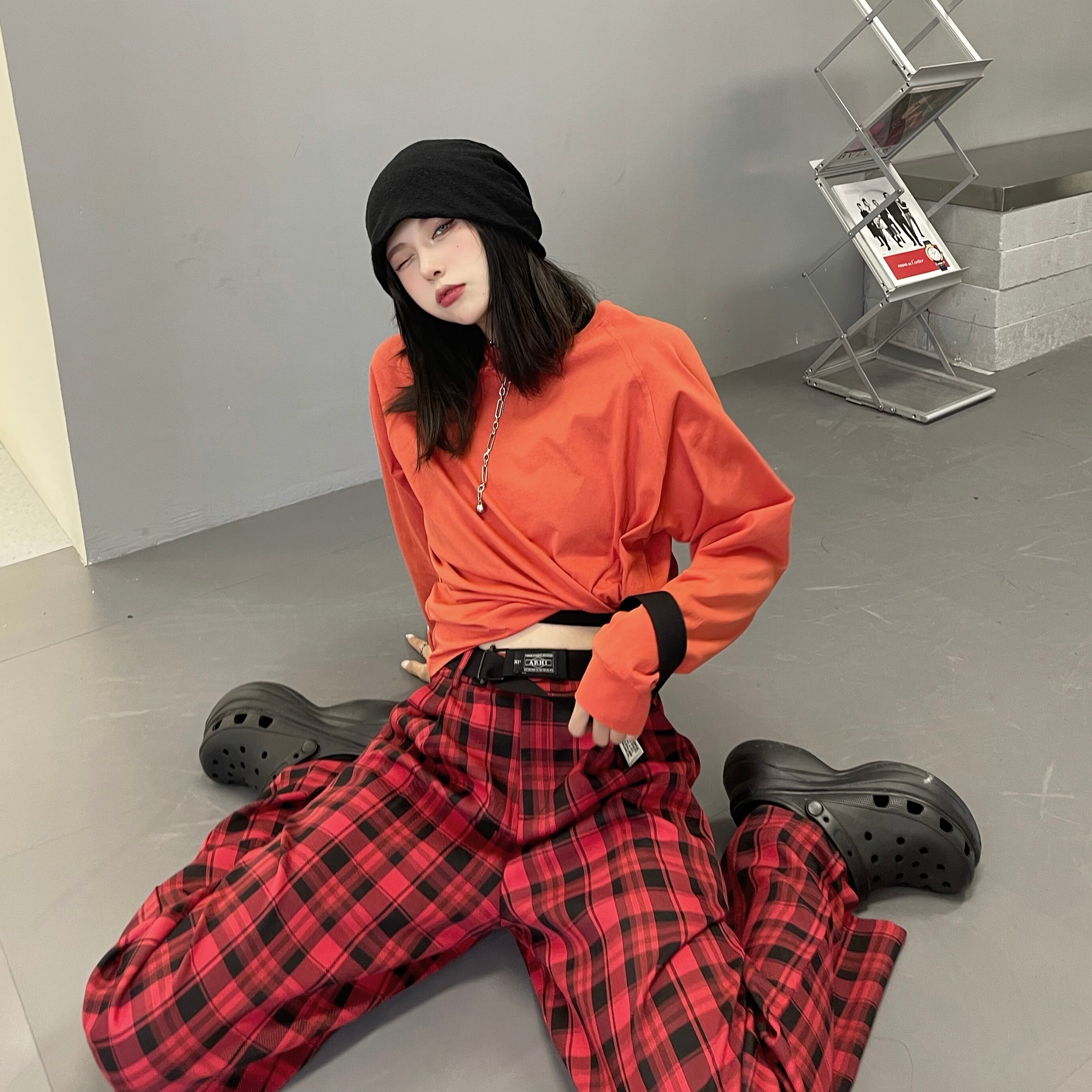 色:オレンジ色のtシャツ,赤いチェック柄パンツ,キャンバスベルト
