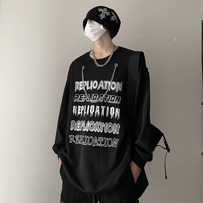 オータムダークプリントチェーン トップス ルーズブラックTシャツ レディース ストリート 秋物 Brother_is_Style77793353952