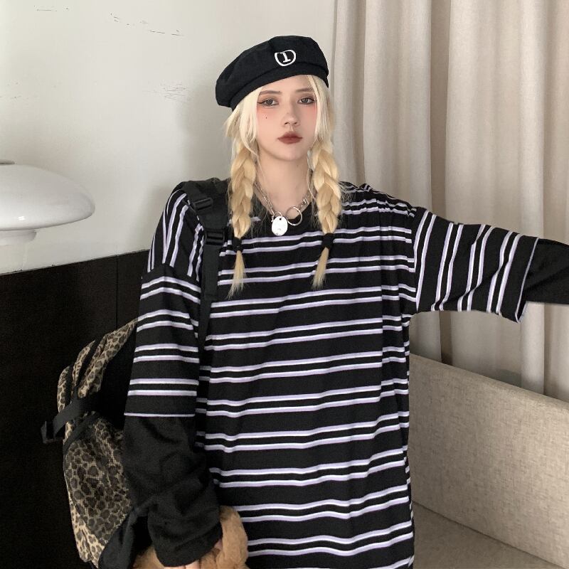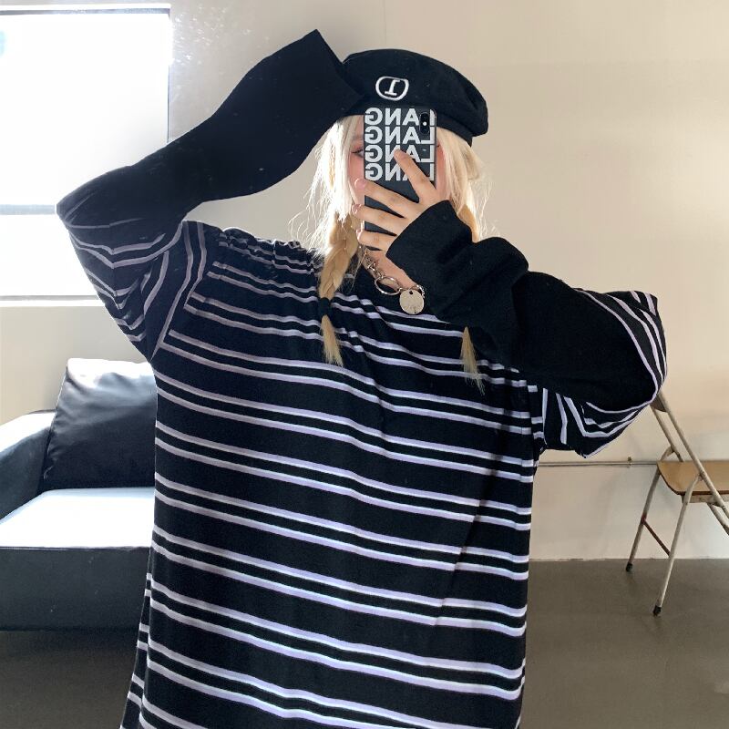 オータムスタンダードストライプラウンドネックTシャツ ルーズトップス レディース ロング レトロ 秋物 Oネック Brother_is_Style13032302382