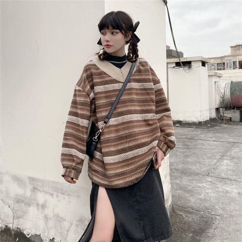 スタンダードスタイルVネックストライプセーター コート ルーズニットトップス レディース ロング レトロ Brother_is_Style53022509592