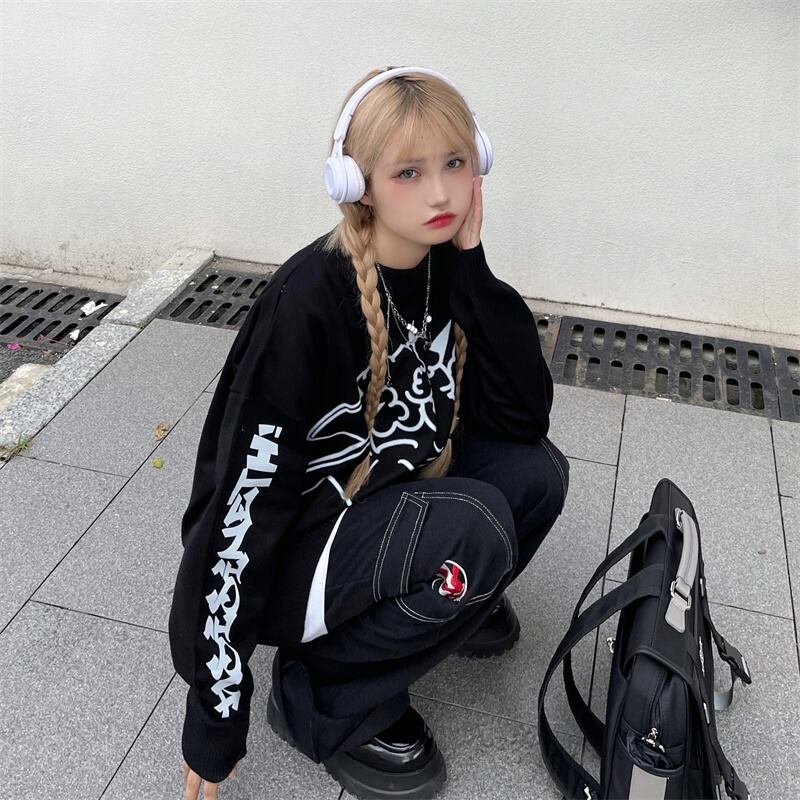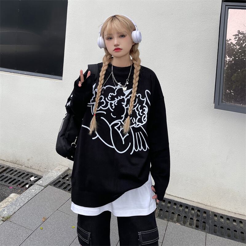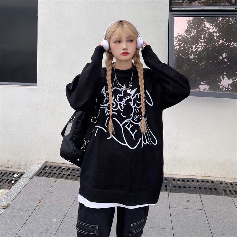 オータムプリントブラックニットセーター コート ルーズトップス レディース ロング ストリート 秋物 Brother_is_Style31986796216