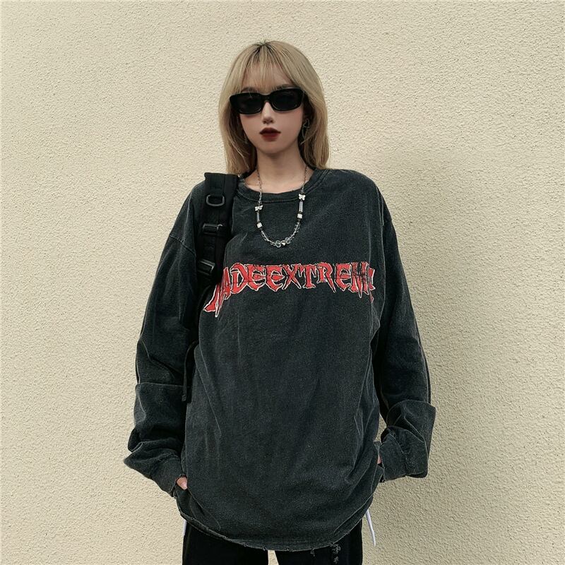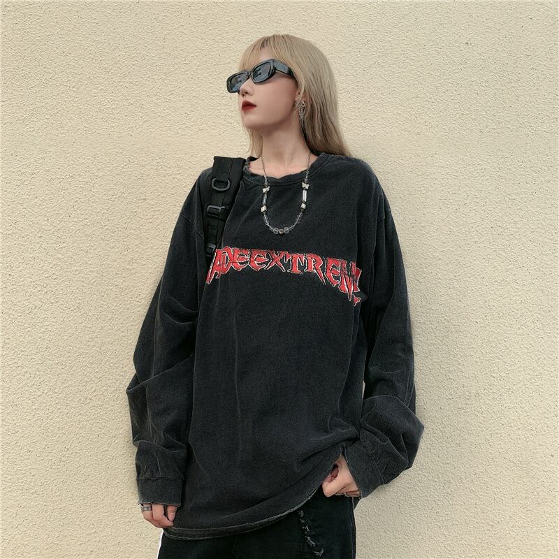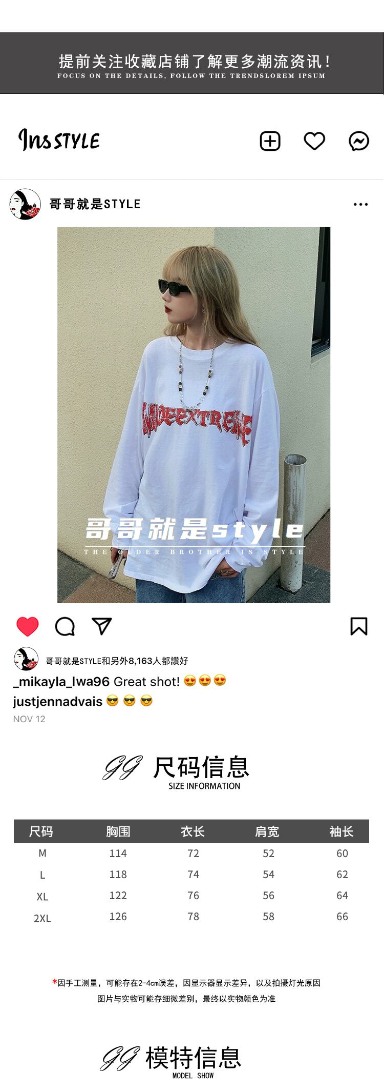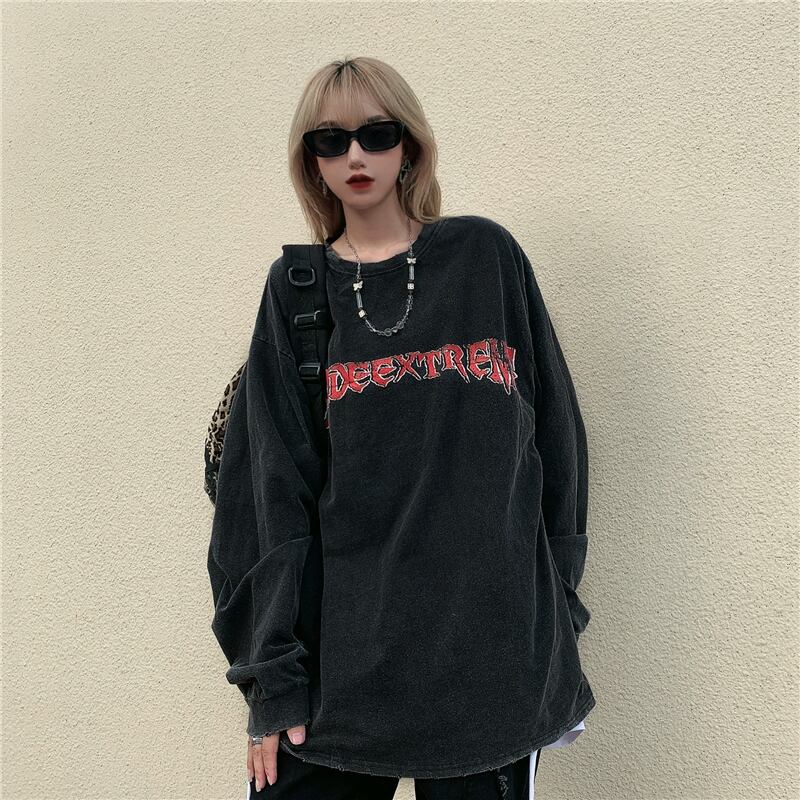 オータムクロスプリント柄Tシャツ ルーズブラックトップス レディース ロング ストリート 秋物 Brother_is_Style58728163156