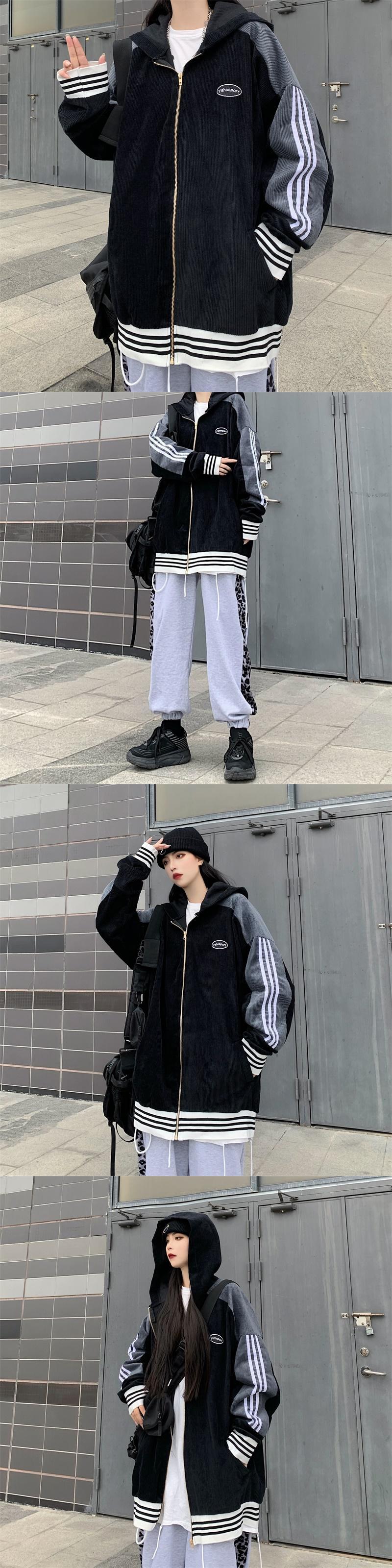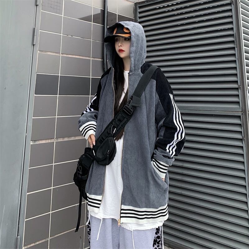 オータムスタンダードコーデュロイフードジッパージャケット ルーズカーディガントップス レディース ロング レトロ 秋物 Brother_is_Style77883566551