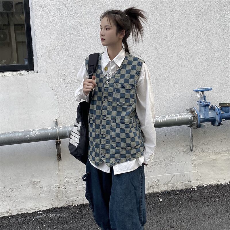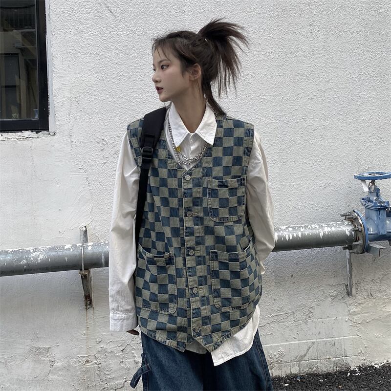 オータムスタンダード格子柄ジャケット ルーズノースリーブカーディガン レトロ 秋物 Brother_is_Style66425386230