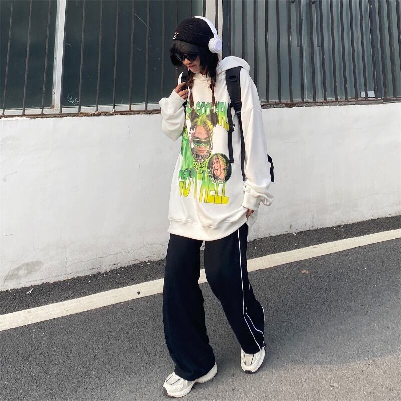 オータムプリントフードセーター コート ルーズブラックトップス レディース ロング ストリート 秋物 Brother_is_Style76721114016