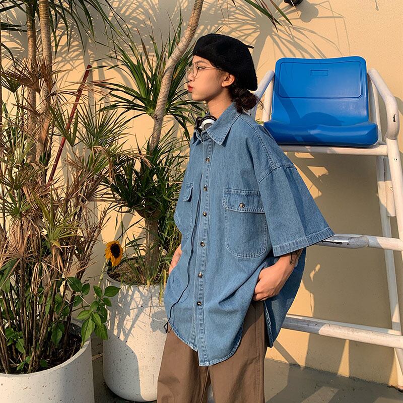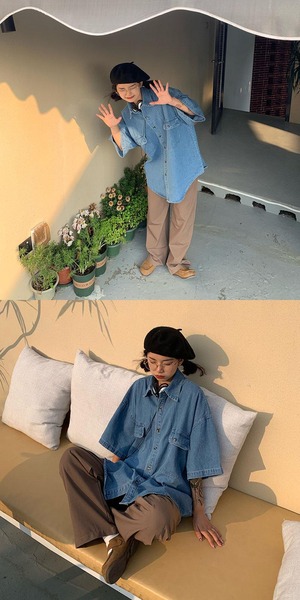 色:デニム半袖シャツ,ベージュストレートレッグパンツ