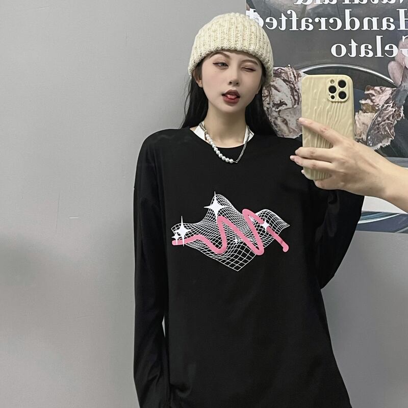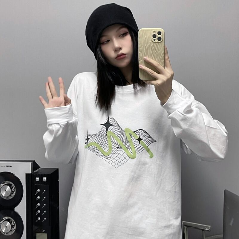 オータムスタンダードプリントホワイトTシャツ ルーズトップス ロング レトロ 秋物 Brother_is_Style5572312318