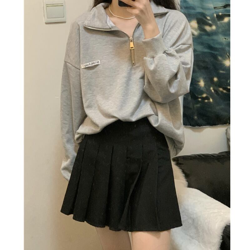 オータムスタンダードジッパーセーター コート ルーズブラックプルオーバー トップス レディース ロング レトロ 秋物 Brother_is_Style18462867689