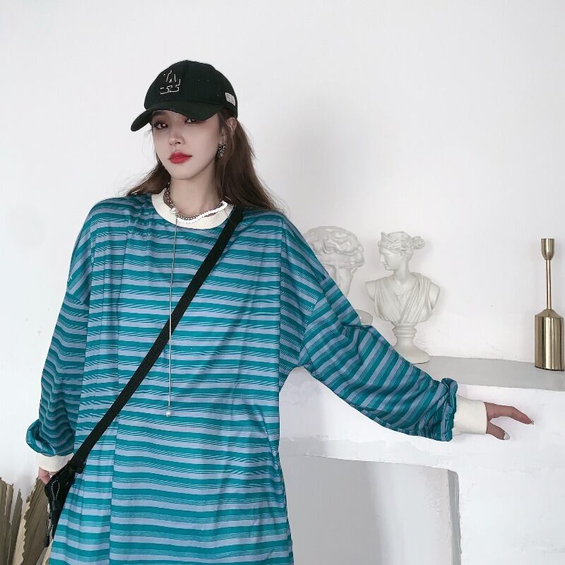 スタンダードストライプTシャツ ルーズラウンドネックトップス レディース ロング レトロ Oネック Brother_is_Style91494077917
