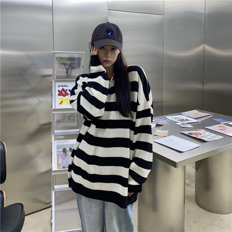 オータムウィンタースタイルストライプカラーセーター コート ルーズニットトップス レディース 秋物 冬物 Brother_is_Style90162885689